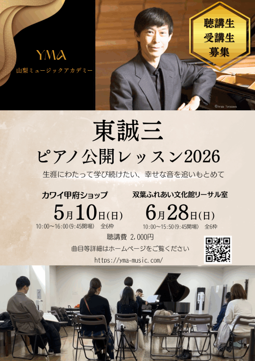 - 2026.04.09 山梨ミュージックアカデミー スプリングコンサート2026 終演のご報告 「山梨ミュージックアカデミー スプリングコンサート2026 東誠三リサイタル&門下生による成果発表」は、3月29日(日)、花かげホールにて、盛況のうちに無事終演いたしました。 ご来場くださいました皆様、ならびに開催にご尽力くださいました関係者の皆様に、心より御礼申し上げます。 今後とも山梨ミュージックアカデミーの活動に、変わらぬご支援とご厚情を賜りますようお願い申し上げます。コンサートの模様はこちらをクリック!
