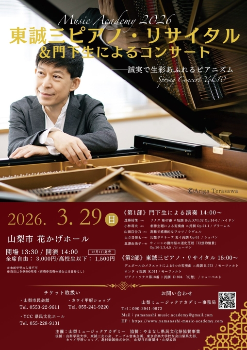 第10回山梨ミュージックアカデミースプリングコンサートを開催いたします。今回は、東誠三先生のリサイタルと5名の門下生の成果発表によるコンサートとなります。会場は「山梨市花かげホール」自然豊かな山々に囲まれた響きの豊かなホールで、東先生の澄んだ音色とそれを受け継ぐ受講生の皆様の演奏をお楽しみいただきたいと思います。